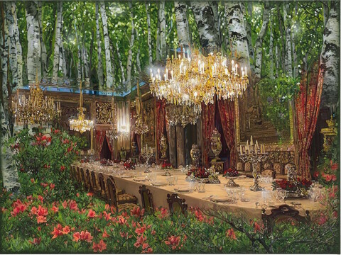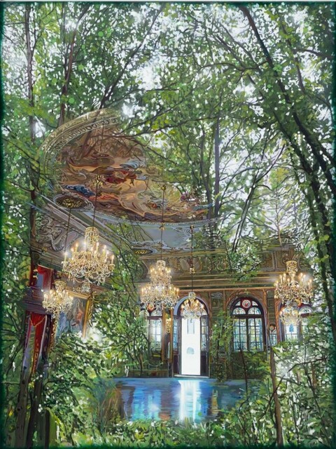 In meiner Kunst suche ich nach einer neuen Verbindung – zwischen Mensch und Natur, zwischen Innenwelt und Außenwelt, zwischen dem, was wir erbaut haben, und dem, was uns erbaut hat. Ich male Räume: Alte, von der Zeit durchdrungene Innenräume, die mit hohen Decken, Stuck, Kristallleuchtern und stiller Würde erzählen, was einmal möglich war. Diese Räume sind keine nostalgischen Kulissen – sie sind fragile Zeugen einer Baukultur, die immer seltener wird.