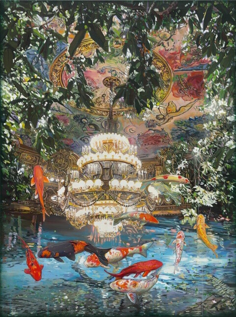 Die Malerei von Marina Sailer schwelgt in kräftigen, aber modulierten und nuancierten Farben, mit denen sie ihre neobarocken, phantastischen Rauminszenierungen gestaltet. Vor funkelnden Kronleuchtern, spiegelndem Glas, üppigen Rankenmustern schweben in morbiden Palästen Fische, Schmetterlinge oder auch Elfenwesen wie in Träumen vorbei.
