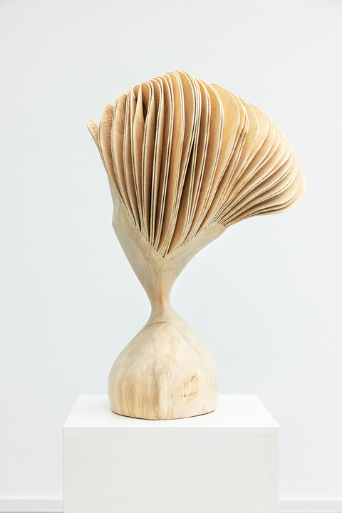 Durch die geschlossene Grundform, der sich eine fächerartige, sich öffnende Einheit anschließt, werden dynamische Öffnung und statische Geschlossenheit thematisiert. Lars Zech überlässt, nach einem ersten Eingriff, in dem das Holz in dünne Scheiben geschnitten wird, es wieder seinen eigenen Kräften: Auch dies ist ein Wechsel von aktiv und passiv, ein Wechsel von Kontrolle und unkontrollierter Entfaltung, die die Eigendynamik des Holzes unterstreicht und eine reizvolle, spannende Gegenüberstellung unterschiedlicher Tendenzen und Impulse aufbaut. Ob diese Arbeiten eher in einem figurativen oder rein abstrakten Kontext zu sehen sind, bleibt offen und kann individuell entschieden werden.