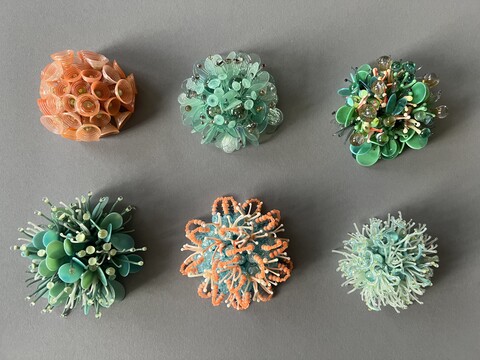 Lea Lenharts Objekte bestehen aus bis zu hunderten kleinen Glaselementen. Die Künstlerin bringt die Einzelteile auf einen mit Garn bestickten Körper auf und bildet aus ihnen dreidimensionale Objekte mit organischen Strukturen.
