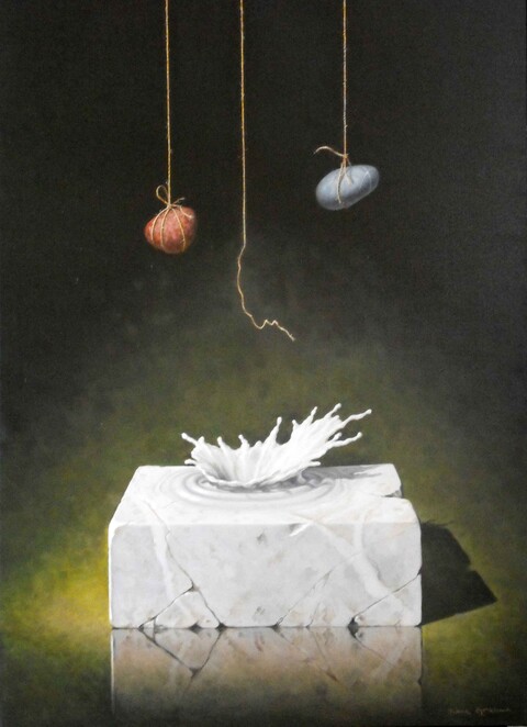 Born in 1960 in Härnösand, Björklund has developed a distinctive artistic language in which the surreal meets the familiar. His paintings are meticulously crafted, often bordering on photorealism, yet they unfold in worlds where logic bends, time slips, and the unexpected becomes inevitable.